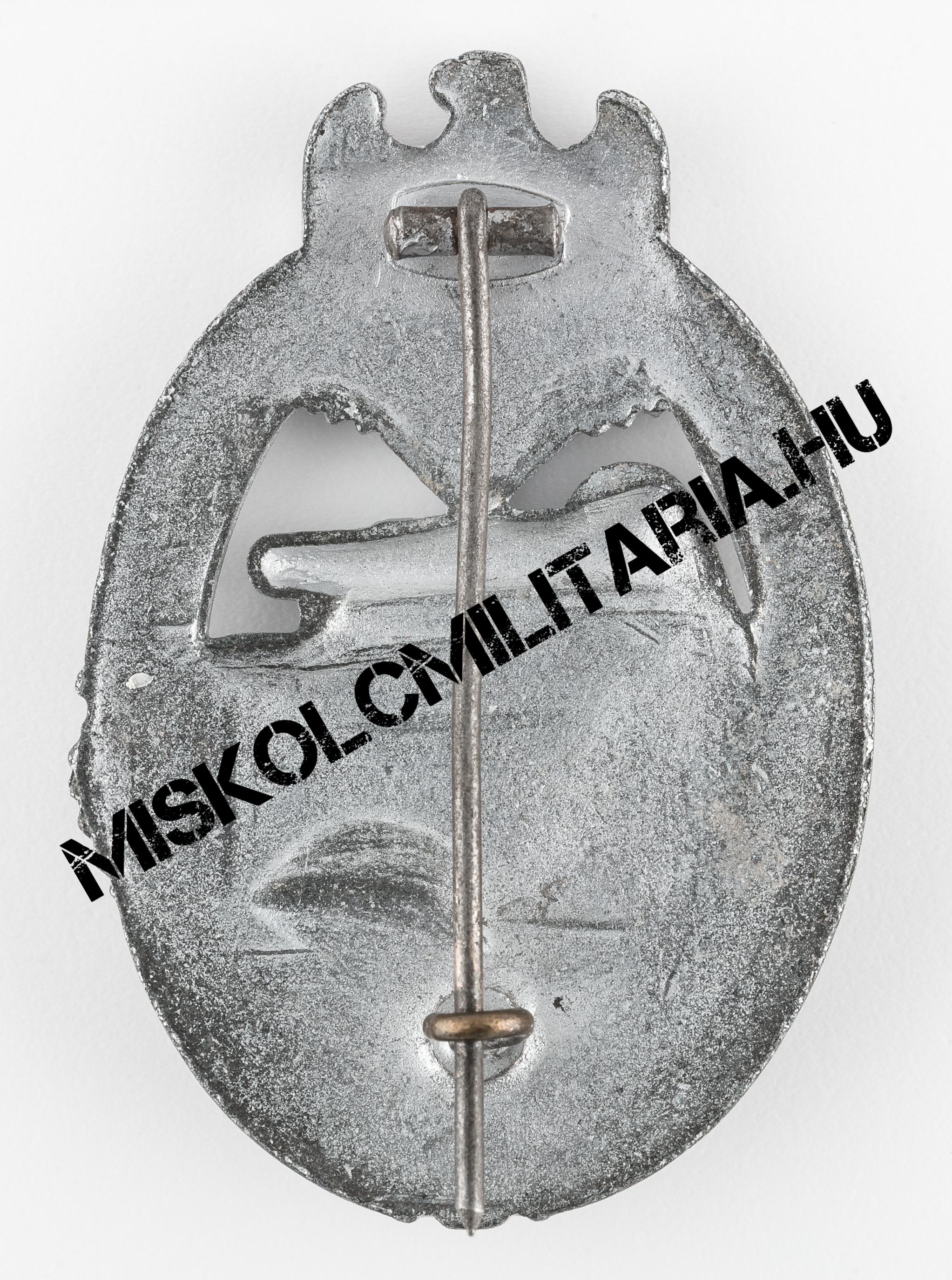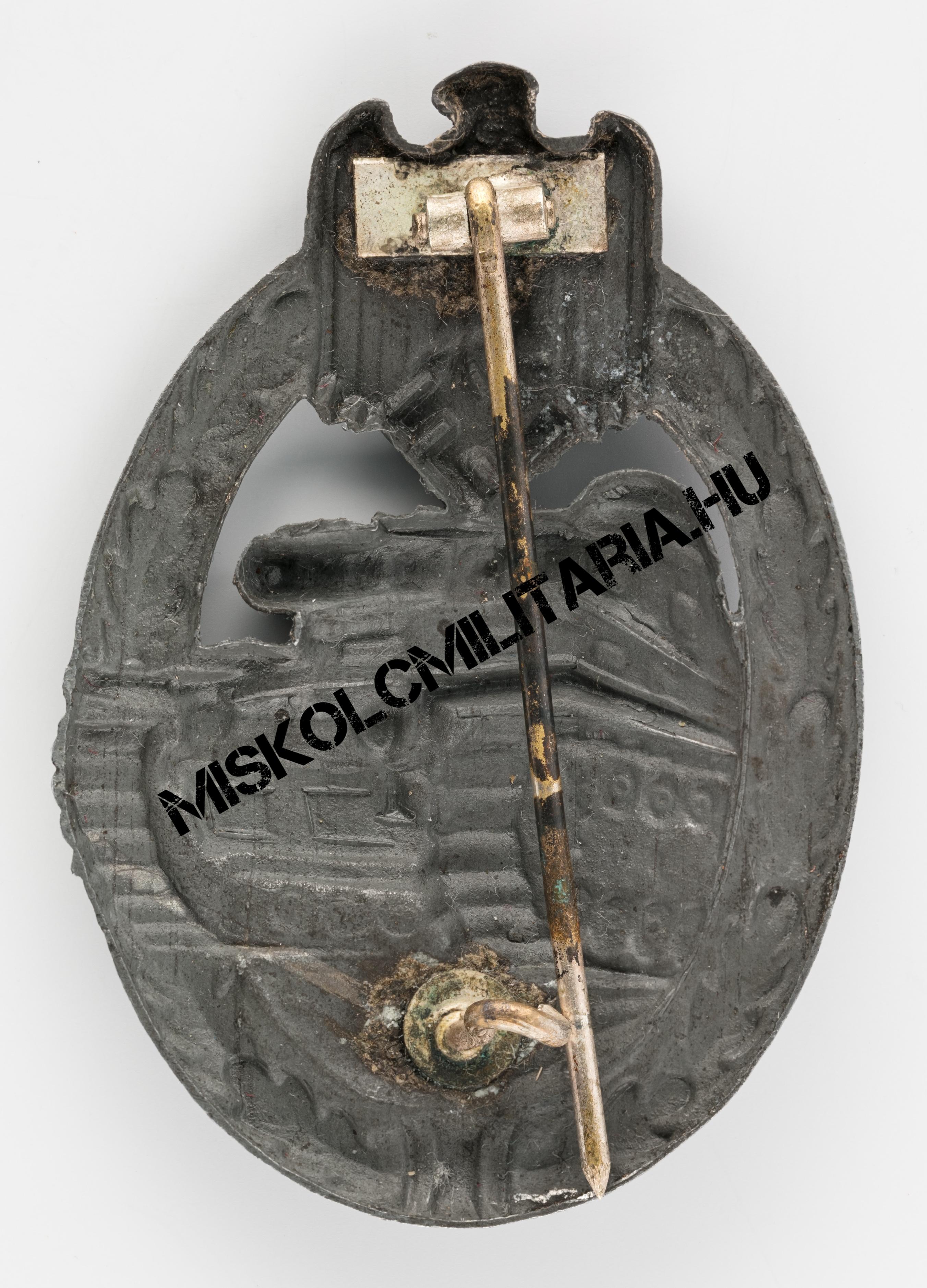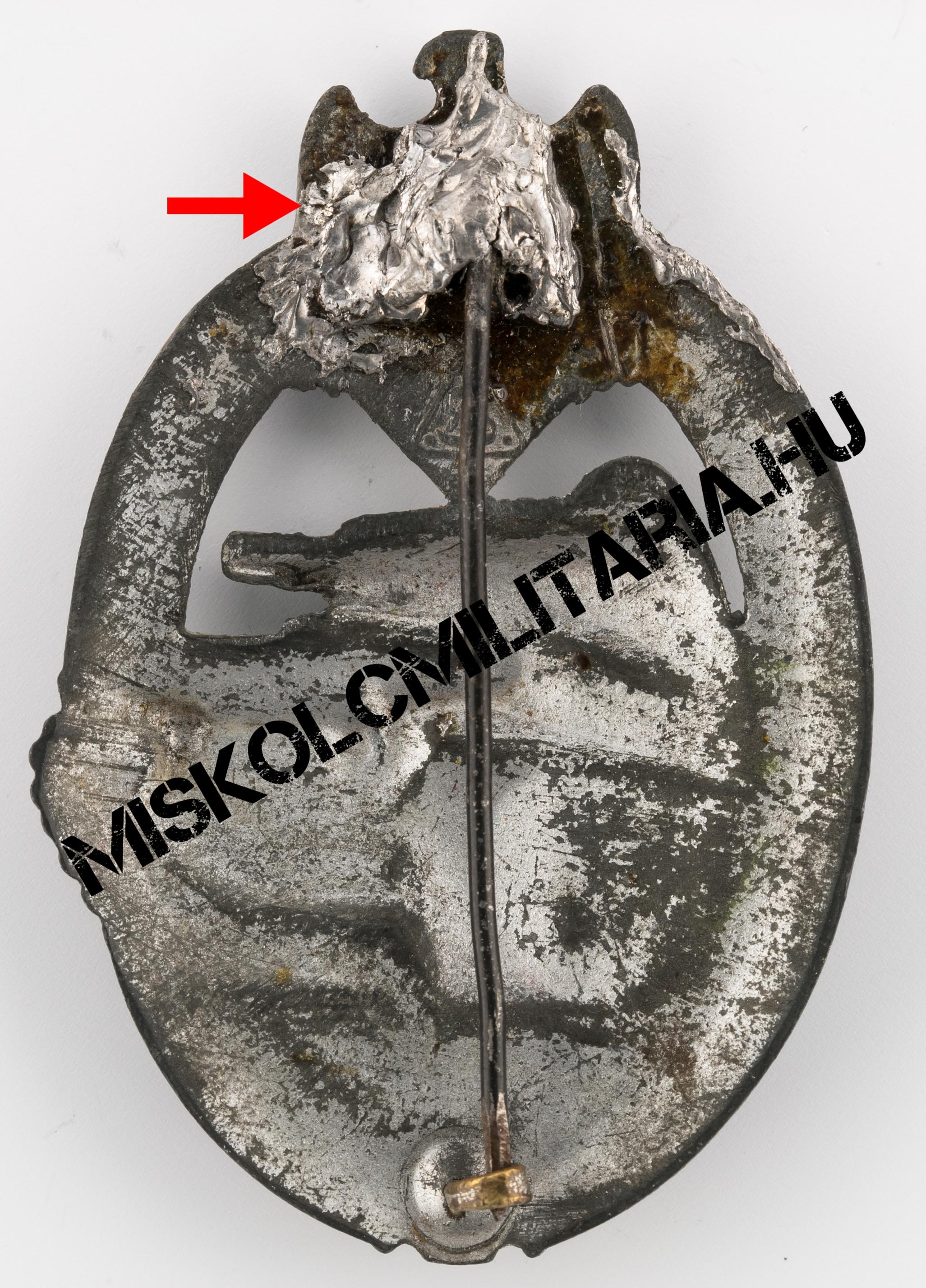 Jelen esetben még igazolható, ha szemügyre vesszük a jelvény hátoldalát, a szoros kapcsolat a Deumer céggel is, hiszen a rájuk jellemző széles, négyzetes talpon ülő zsanért mindkét cég előszeretettel használta. Beakasztókampója kérdőjel forma, amely kerek lemez talpazaton ül. További jellegzetes vonás, hogy színtartása ennek az alapanyagnak jellemzően gyenge, amely mögött nem csak a felhasznált anyag okozza a problémát. Megfigyelhető és több, mint valószínű, hogy sem az előkészítés, sem a felvitt anyag vastagsága nem volt ugyanolyan, mint a háború korai éveiben.