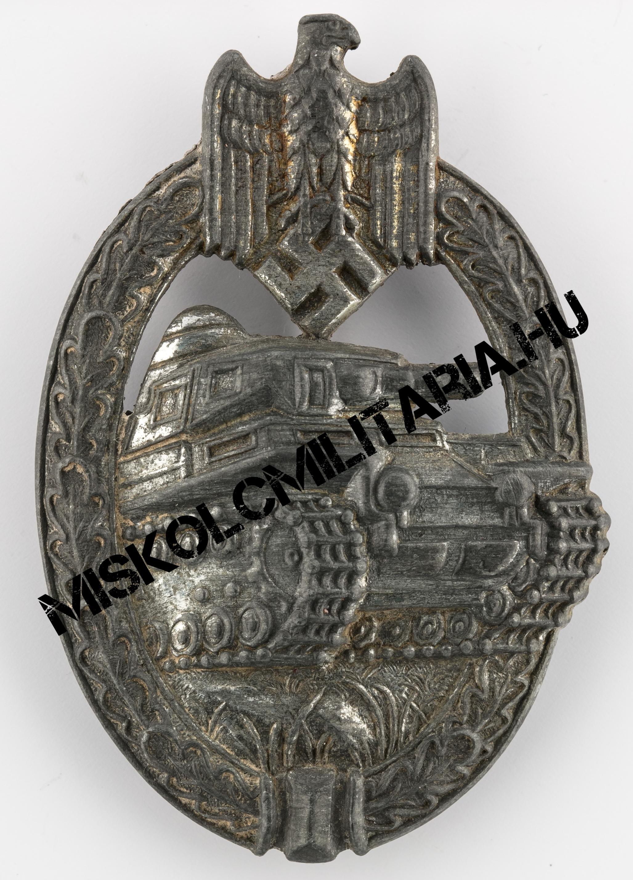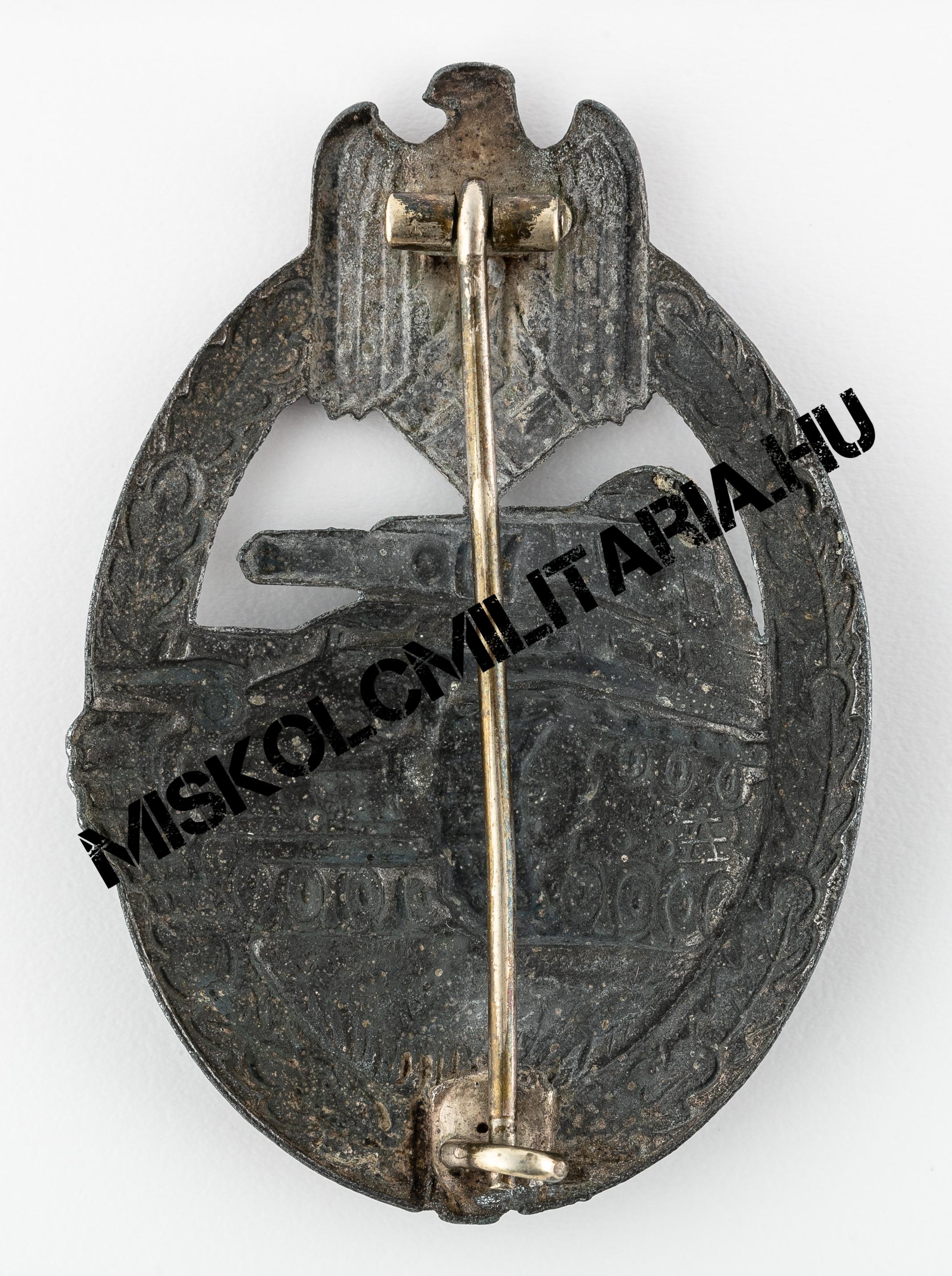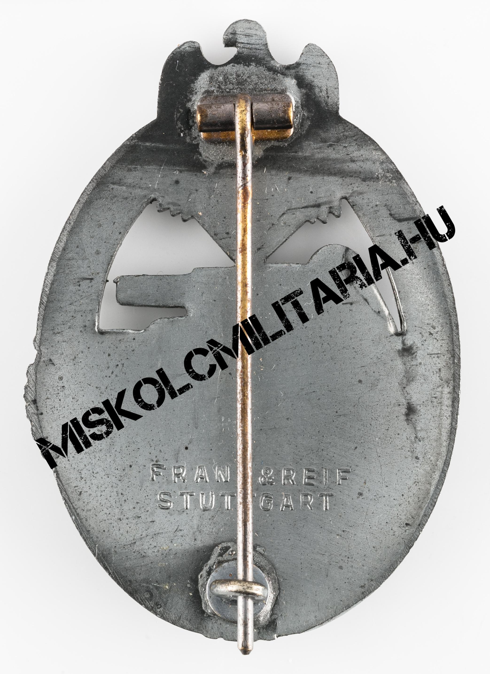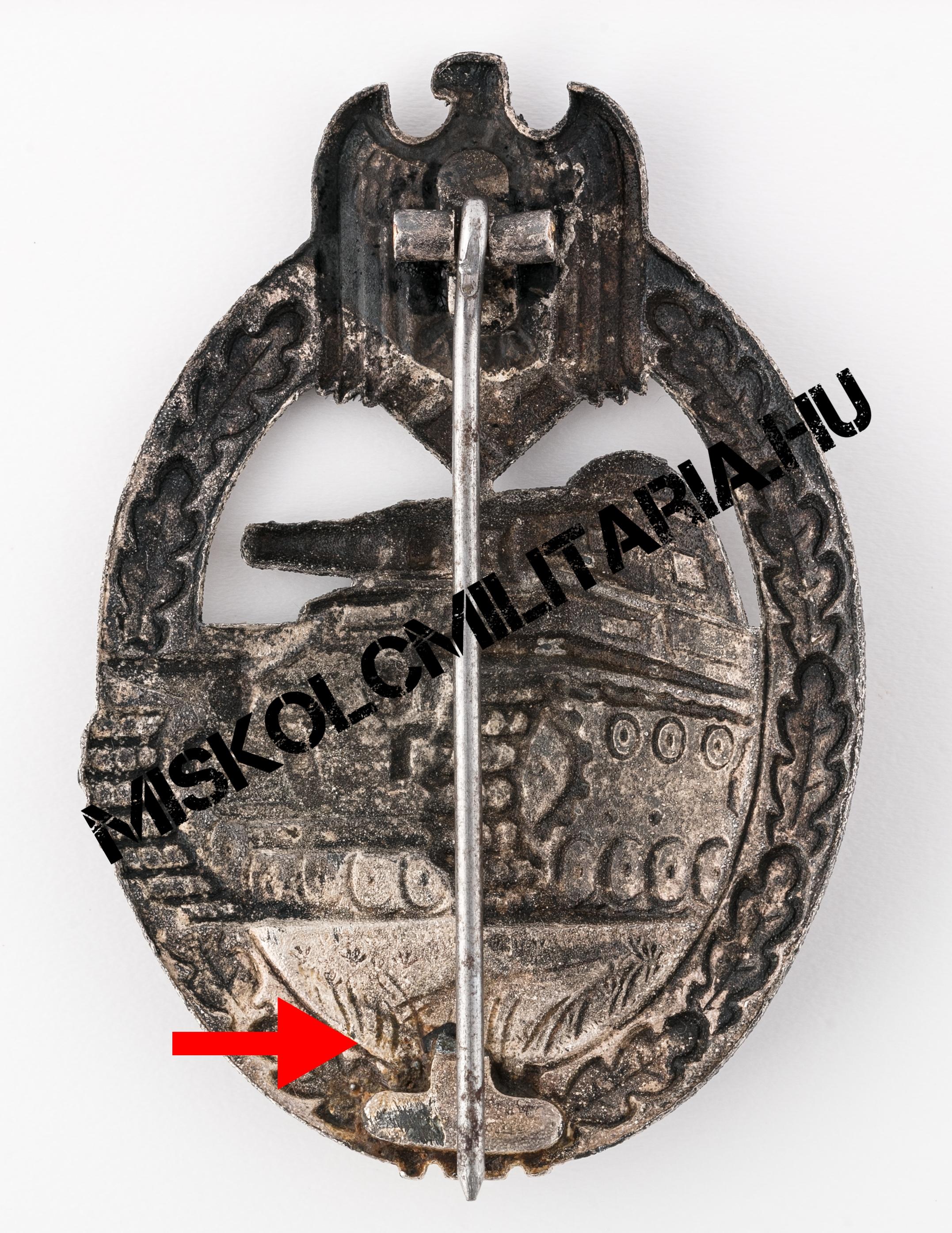Jelen esetben még igazolható, ha szemügyre vesszük a jelvény hátoldalát, a szoros kapcsolat a Deumer céggel is, hiszen a rájuk jellemző széles, négyzetes talpon ülő zsanért mindkét cég előszeretettel használta. Beakasztókampója kérdőjel forma, amely kerek lemez talpazaton ül. További jellegzetes vonás, hogy színtartása ennek az alapanyagnak jellemzően gyenge, amely mögött nem csak a felhasznált anyag okozza a problémát. Megfigyelhető és több, mint valószínű, hogy sem az előkészítés, sem a felvitt anyag vastagsága nem volt ugyanolyan, mint a háború korai éveiben.
