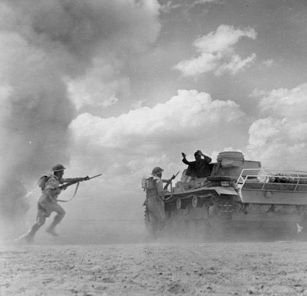 8. Kép - Egy páncélos legénysége megadja magát Észak-Afrikában. Jól érzékelteti a fotó, hogy a propagandával ellentétben a páncélosok személyzete extrém megterhelésnek volt kitéve (zaj, hő, por), amely szinte minden esetben nem csak a veteránok lelkében, hanem a tárgyi emlékek között is bőségésen hagyott nyomokat.
